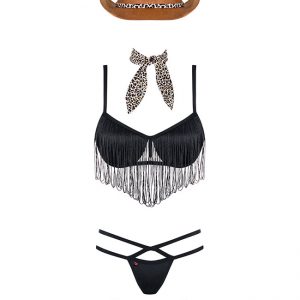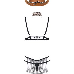 - zestaw zawiera staniczek, stringi podwiązki, apaszkę i kapelusz z odznaką