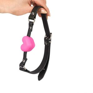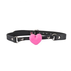 Różowy knebel w kształcie serca na regulowanych czarnych paskach wykonanych z imitacji skóry. Ø serca 4 cm. Materiał: poliuretan, silikon, bez ftalanów zgodnie z Rozporządzeniem UE REACH.