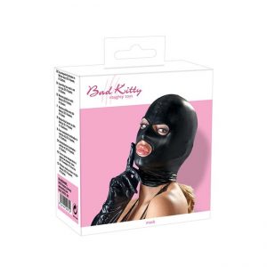 Dopasowana maska wykonana z bardzo błyszczącego czarnego materiału. Z otworami na usta i oczy.