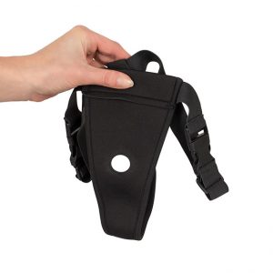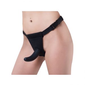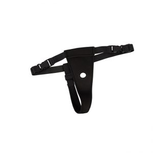 Czarna uprząż z lekko elastycznym otworem z przodu (2,1 cm) na wibrator lub dildo z podstawą (brak w zestawie). Obwód można regulować w zakresie 80-120 cm, dzięki zapięciu na klamrę.