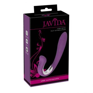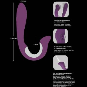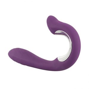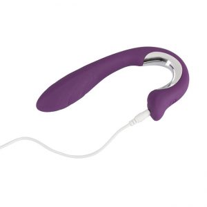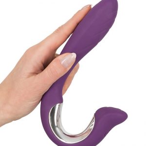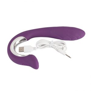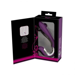 Fioletowy wibrator w kształcie litery U z małymi, stymulującymi rowkami na grubszej części wału i stymulatorem łechtaczki. Ma również dekoracyjną część w kolorze srebrnym. Z 10 trybami.
