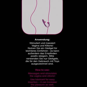 Można go naładować za pomocą dołączonego kabla USB. Długość 18,5 cm, głębokość wstawienia 13 cm, Ø 2-3.3cm, stymulator łechtaczki o długości 4 cm. Materiał: silikon z powłoką poliuretanową, ABS.