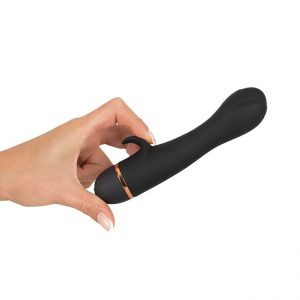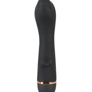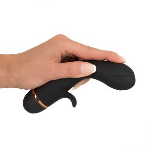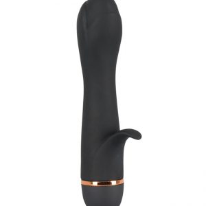 Elastyczny, czarny wibrator w kształcie królika z zaokrągloną głowicą. Stymulator łechtaczki ma kształt małego liścia. 20 trybów wibracji za naciśnięciem przycisku.