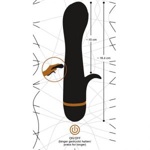 Całkowita długość 16,4 cm, głębokość wsuwania 10 cm, Ø 2,4-3,4 cm. Materiał: silikon, ABS z powłoką poliuretanową. Bez ftalanów zgodnie z Rozporządzeniem UE REACH. Baterię należy zamawiać osobno: 1 x AA / Mignon.